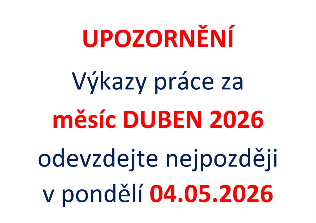 Žádáme všechny zaměstnance, aby potvrzené výkazy práce za měsíc DUBEN 2026 doručili do kanceláře nebo vhodili do schránky nejpozději v pondělí 04.05.2026.